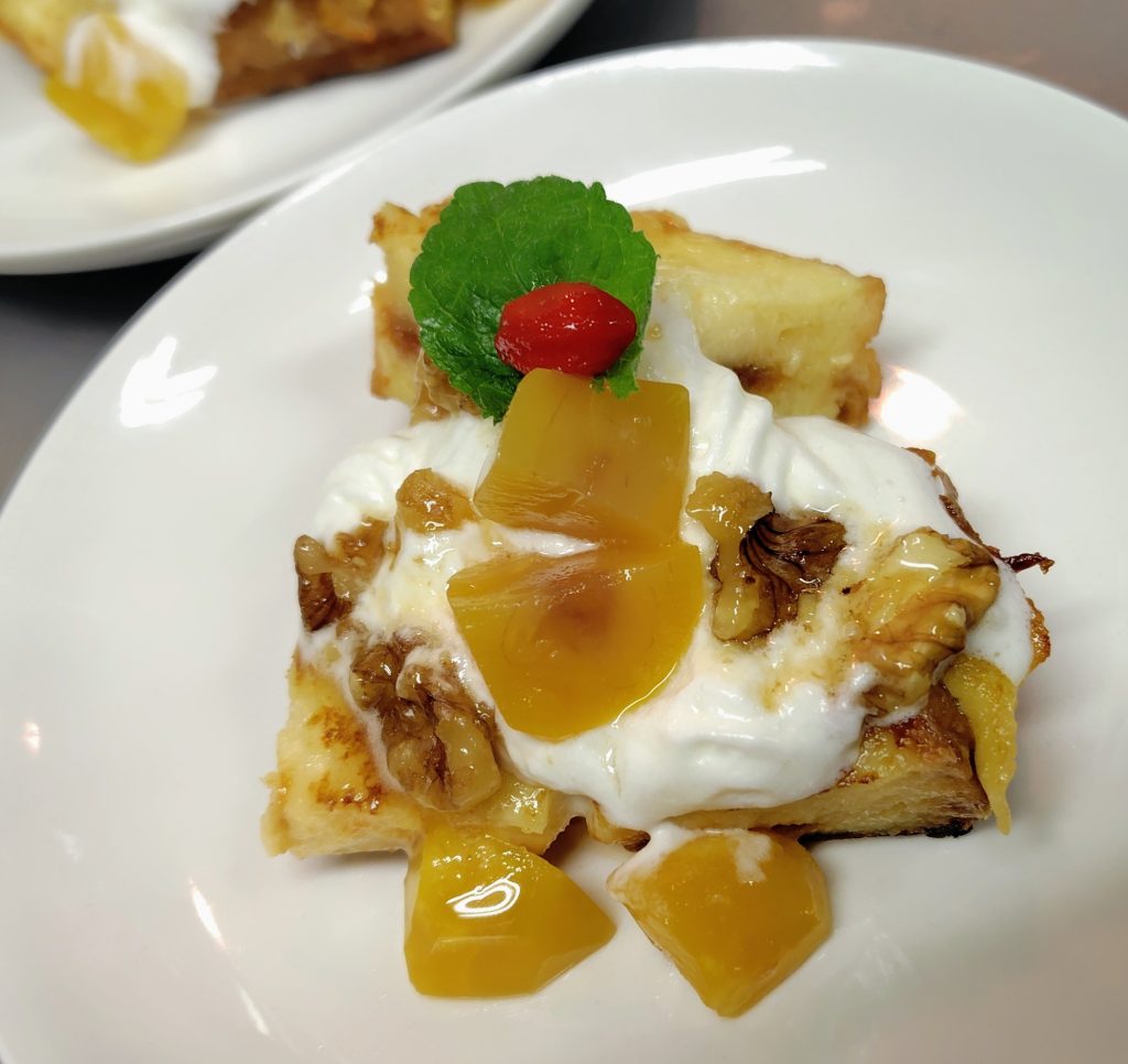 2、香港式フレンチトースト、きなこバターとクリームとメープル風味クルミと栗添え