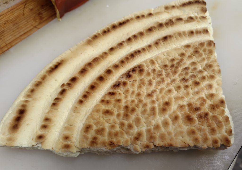 直径約50センチ、厚さ約2.5センチ、重さ約5斤(約2.5キロ)の4分の1、外がこんがり、中がもちもち、小麦の香りがたまらないです。