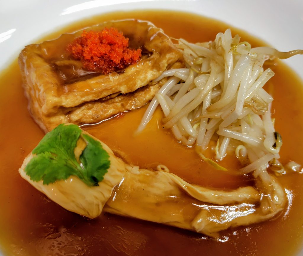 フカヒレの客家豆腐詰め蒸し、飛び子乗せ、たくり湯葉添え