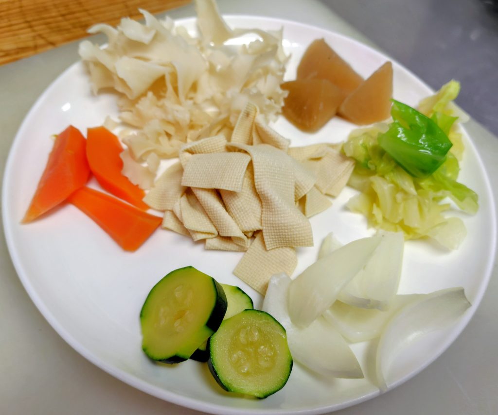 鍋に油を少し引いて、ネギなどの薬味を香り出るまで炒め、用意した材料を入れて、