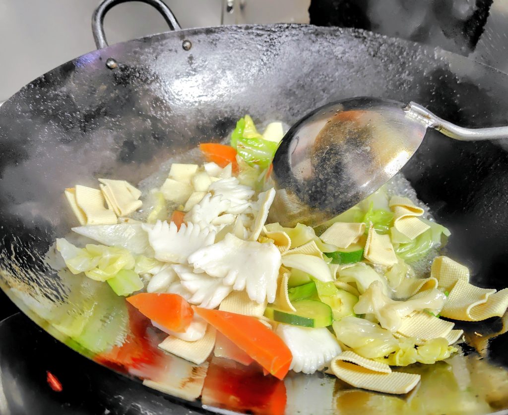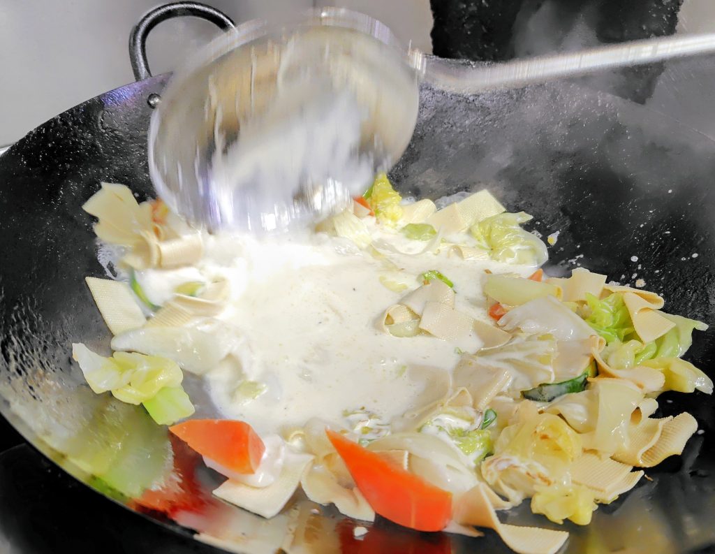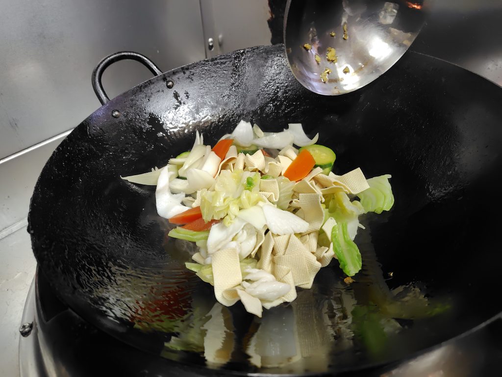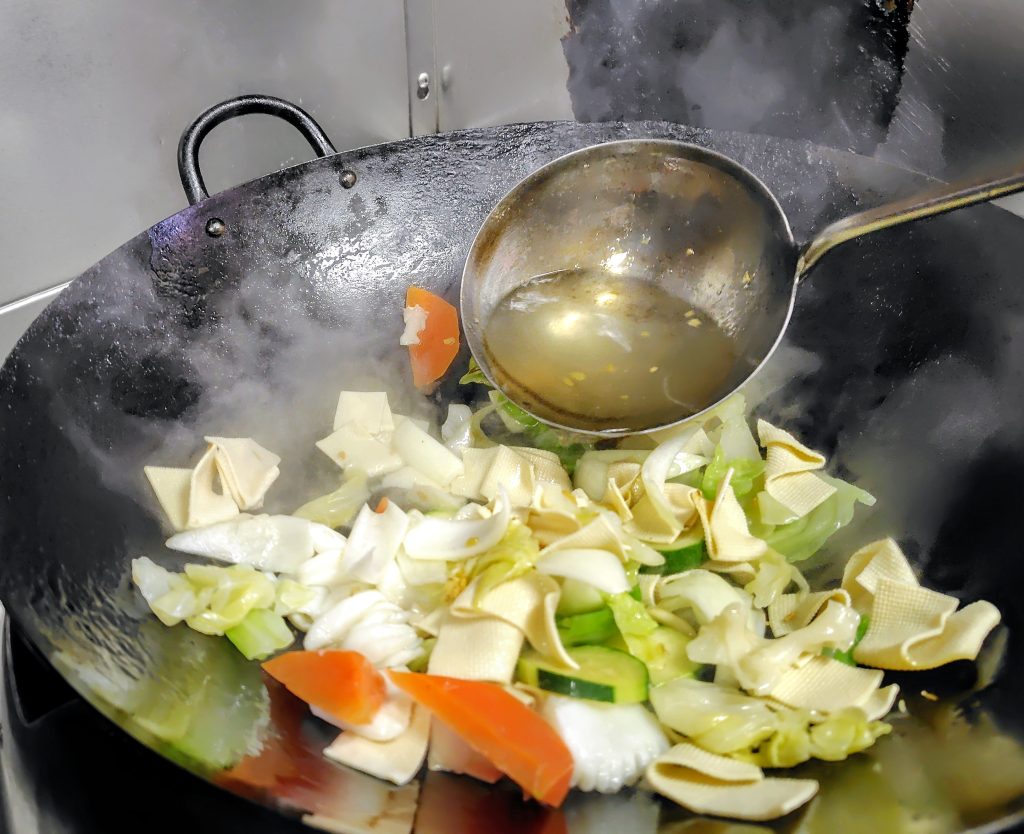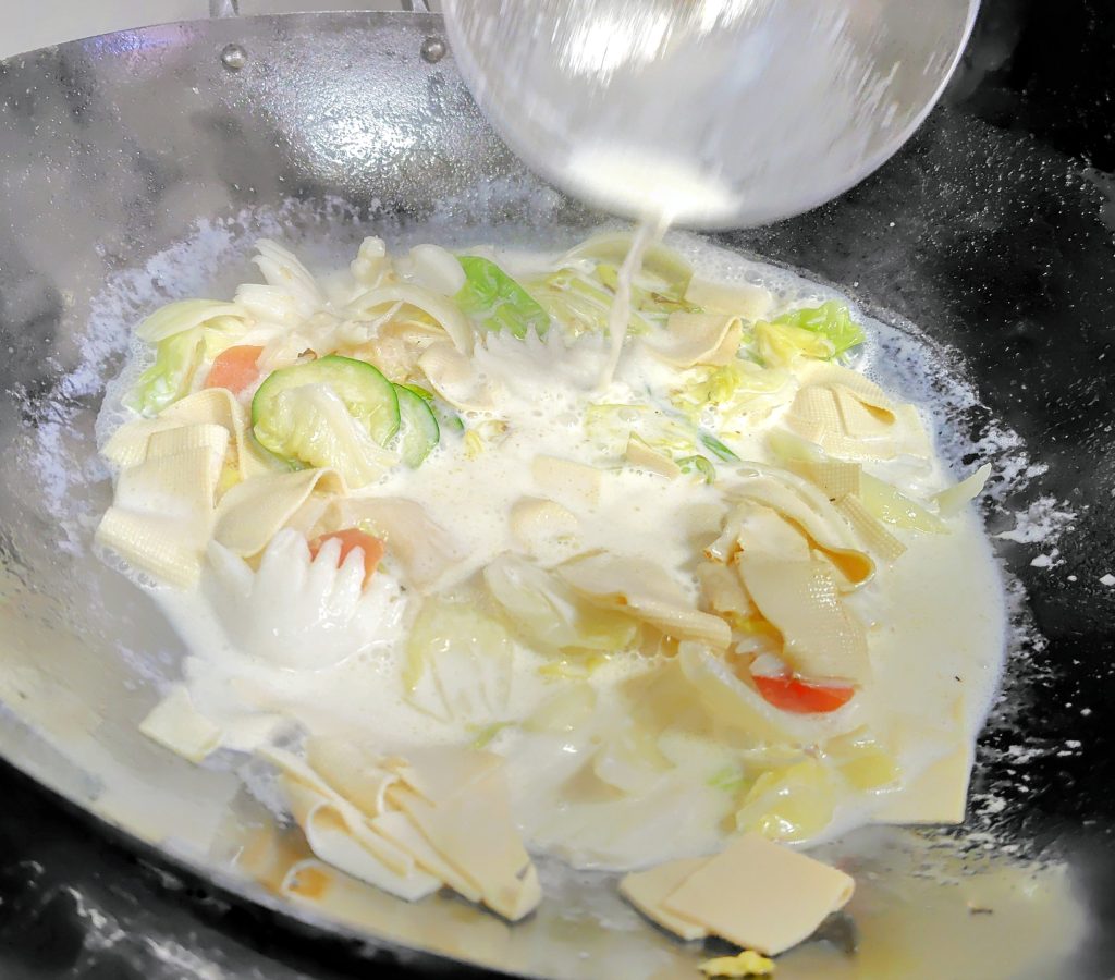 煮込み、しお、胡椒で味を整えてから、溶き片栗粉でとろみをつけて、最後に自家製中国ネギ油を香りを付けて