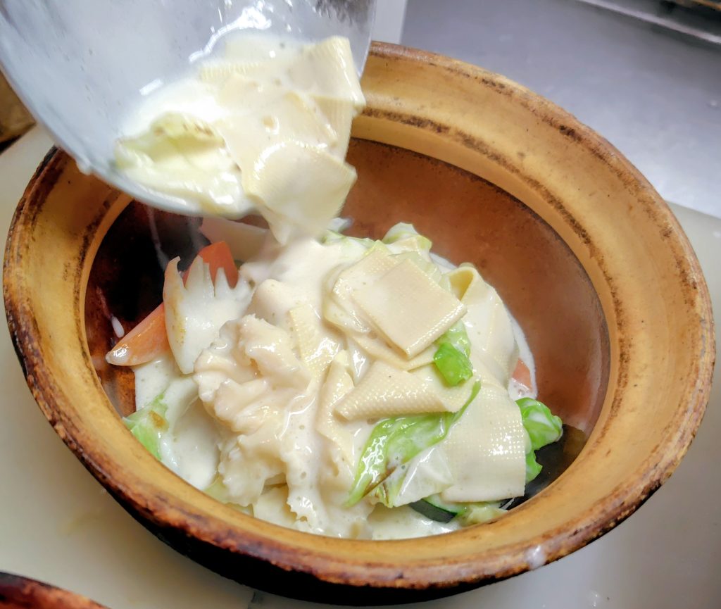 今日の日替わりランチは2026年明楓冬砂鍋ランチ第二十六弾「イカと季節野菜の自家製中国式砂鍋クリーム煮込み」となっております。いつも白身魚で作っているけど今日は初めてイカで作りました。