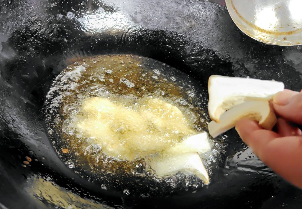 豆腐を水切って、小さくサイコロ状に切って、高温の油で揚げます。