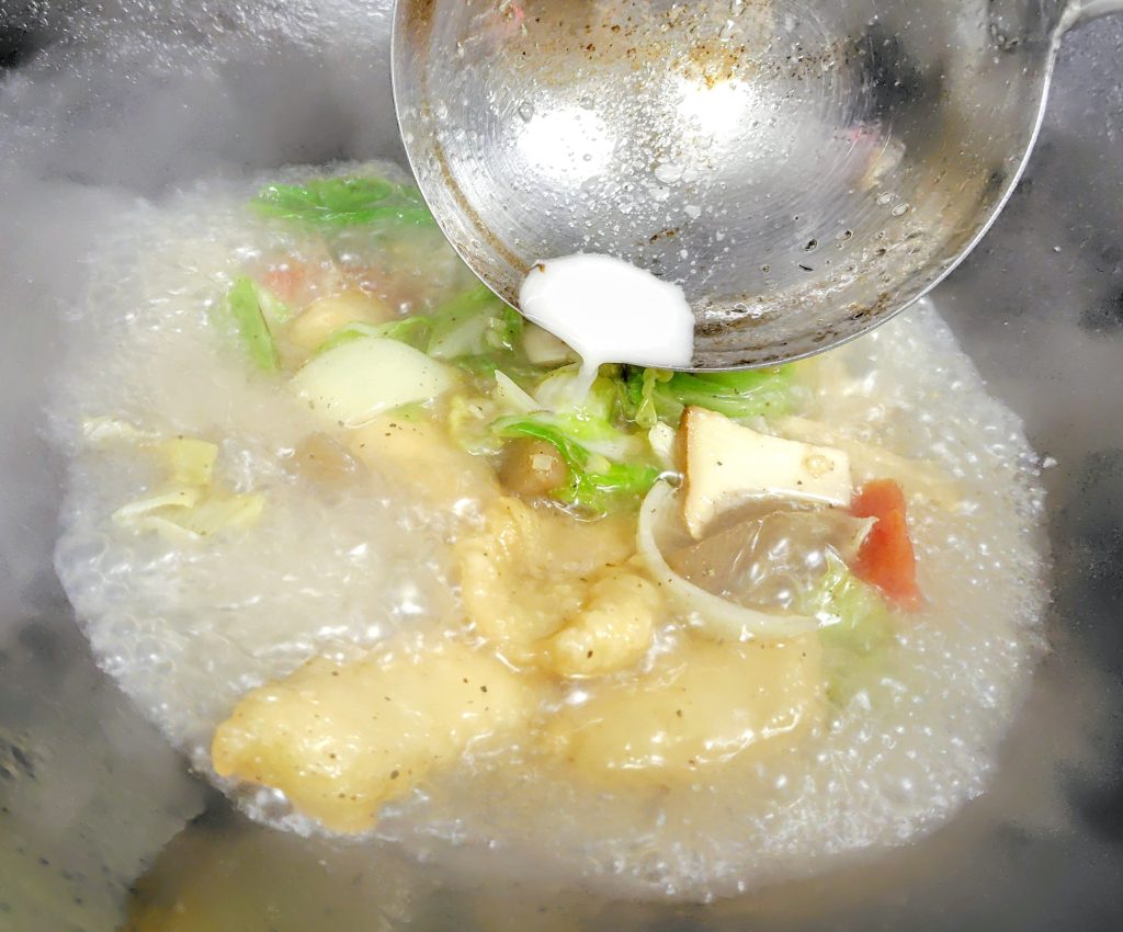 自家製鶏がらスープを加えて塩、あらびき黒胡椒を入れて、味を整え
