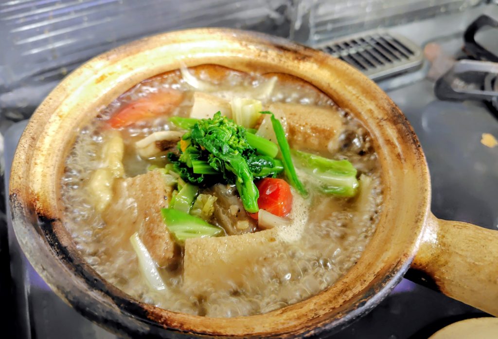 煮込みした白身魚と野菜を入れて、蓋をして、もう一度煮沸かしたら、今日の日替わりランチ—2026年明楓冬砂鍋ランチ第二十八弾「白身魚と揚げ豆腐の黒胡椒風味砂鍋煮込み」が完成です。