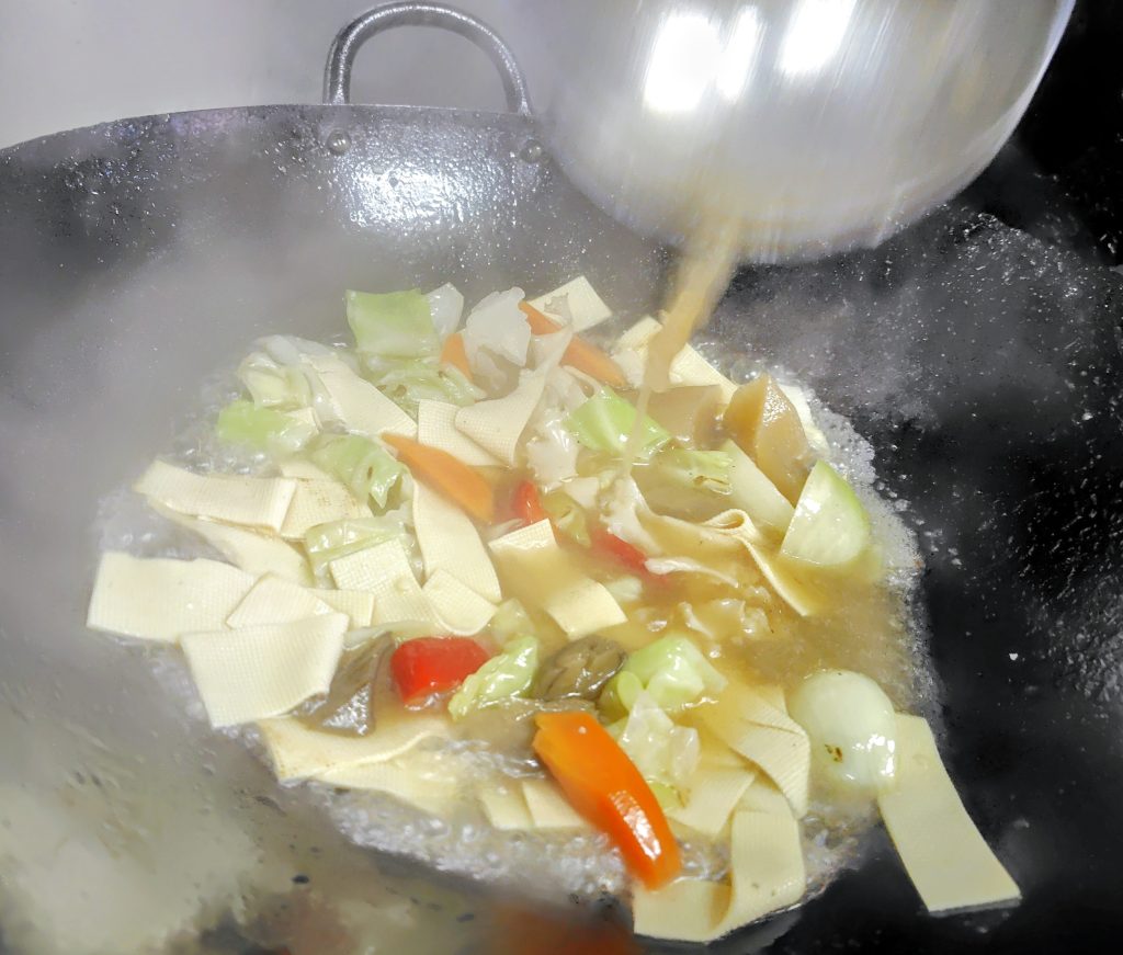 用意した鶏肉、中国布豆腐、彩野菜などを入れて、炒め、明楓自家製鶏がらスープを加えて、オイスターソースで味を付けして、
