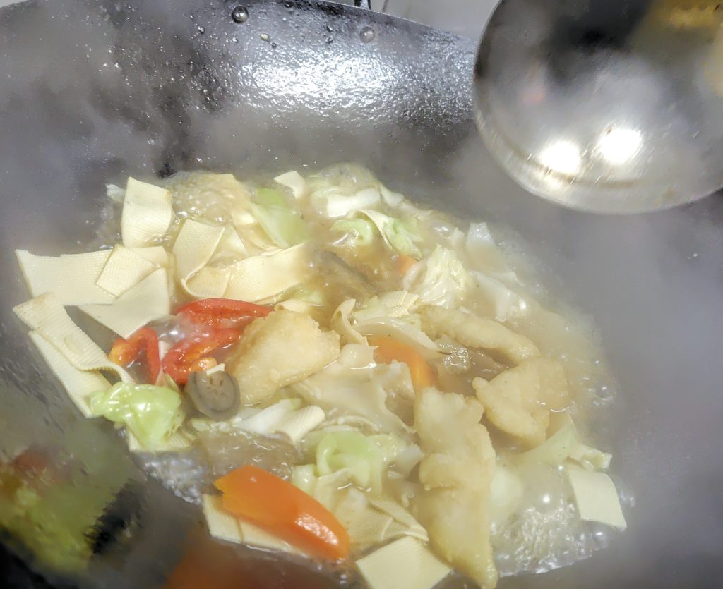 オイスターソースの香りを漂って、柔らかい白身魚と中国布豆腐はしっかり野菜のうまみを吸い込んで、あっさりとした味付けだけど、色なうまみを混じり合って、深いうまさが食欲を注ぐ、ご飯が進みます。
