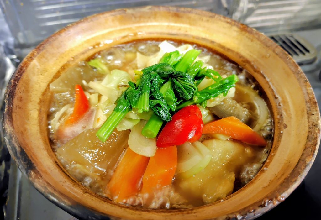 味を染みるまで炒め煮し砂鍋に移して、菜の花を乗せて、蓋をして、火をつけて、もう一度煮立ったら、今日の日替わりランチ2026年明楓冬砂鍋ランチ第三十四弾「白身魚と中国布豆腐の広東風砂鍋煮込み」が完成です。
